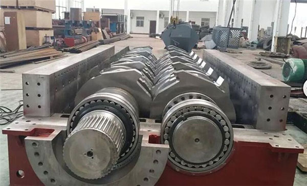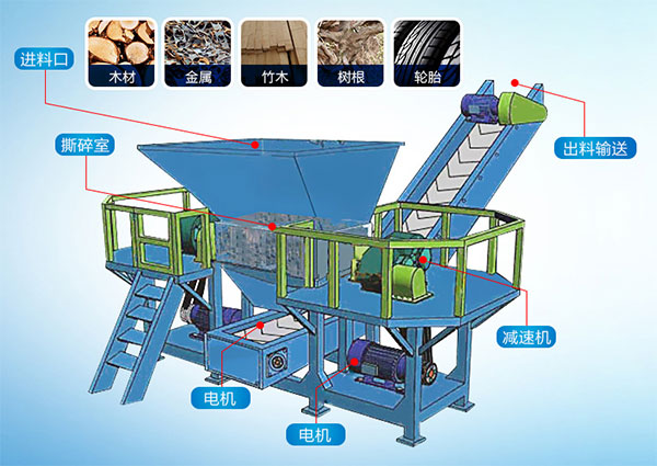 輪胎撕碎機是利用兩個耐磨撕碎齒輥,工作時兩個撕碎齒輥之間實行相對旋轉(zhuǎn),形成一個V型撕碎齒腔,產(chǎn)生的剪切力來破碎物料,物料進入兩齒輥間隙(V型破碎腔)以后,受到兩齒輥相對旋轉(zhuǎn)的剪切力作用, 將進入的物料撕扯、剪切至需要的粒度由排料口排出。
